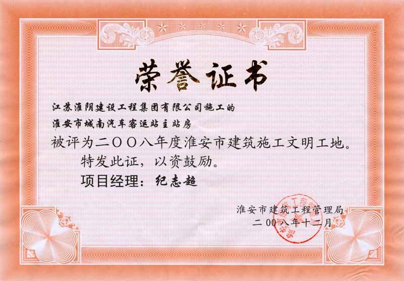 2008年市文明工地淮安市城南汽车客运主站房-纪志超