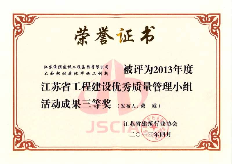2013年度江苏省工程建设优秀质量管理小组活动成果三等奖(戴威-大面积耐磨地坪施工创新)