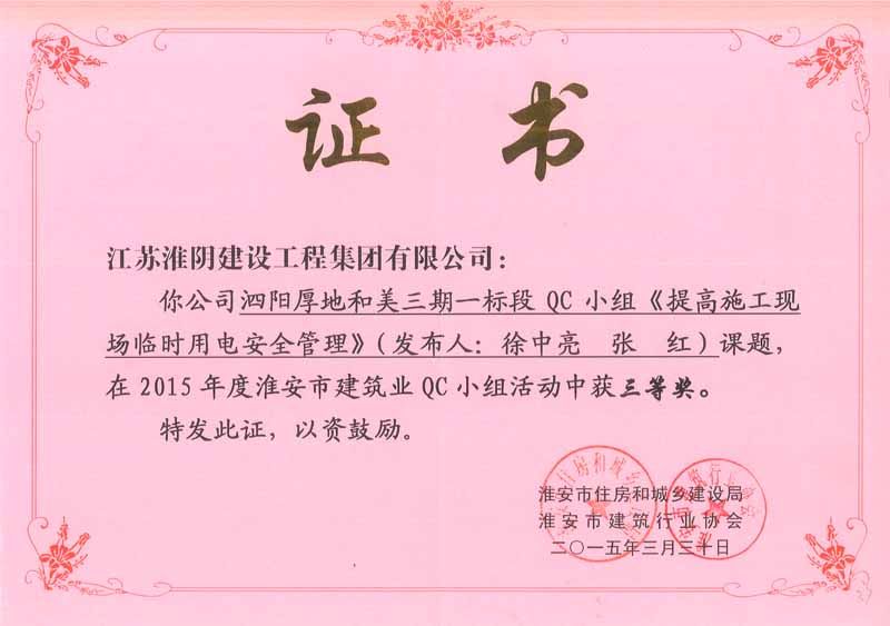2015年全国工程建设优秀质量管理小组二等奖厚地和美三标