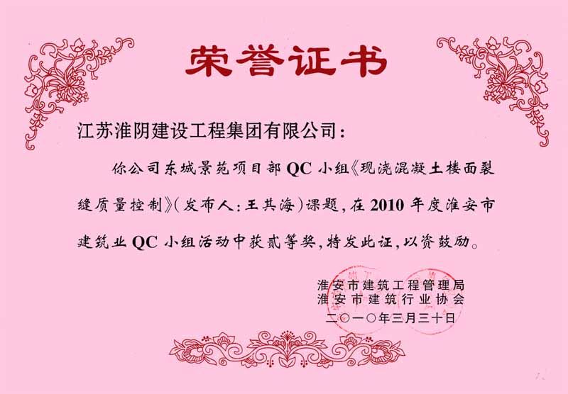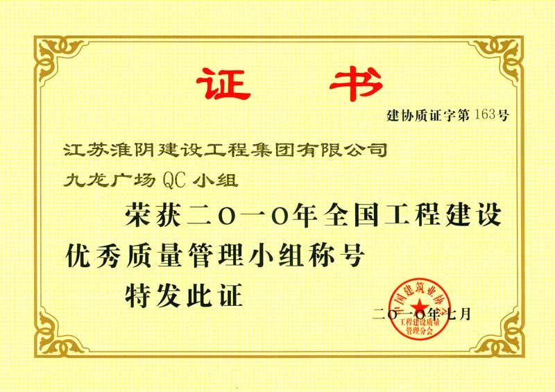 2010年全国工程建设优秀质量管理小组(九龙广场)